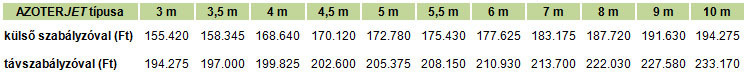 AZOTERJET nettó ára különböző kivitelben és permetezési szélességben: